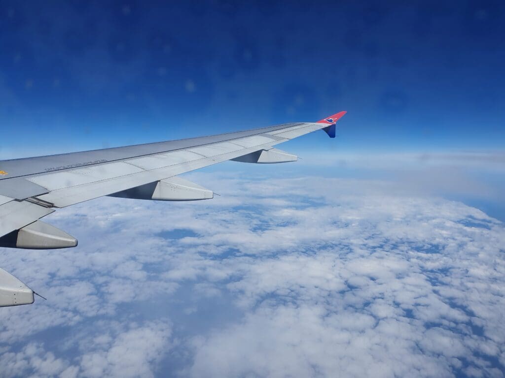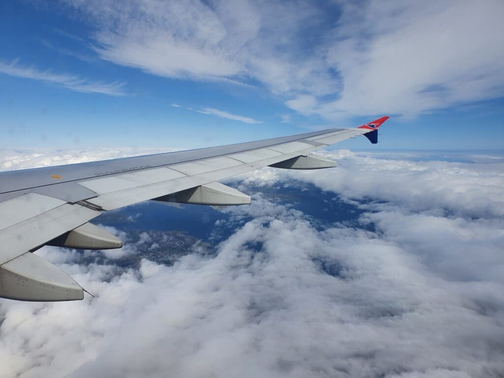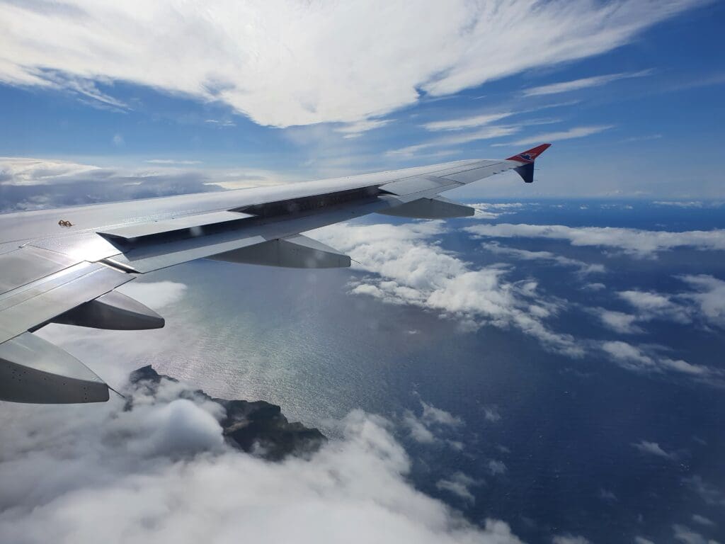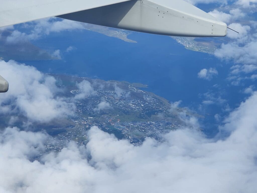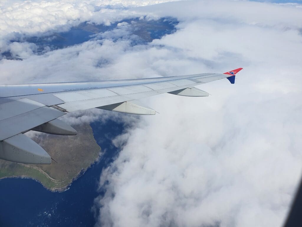 Around halfway between the Shetlands and the Faroes, at 1302 local time the aircraft could be felt leaving its cruising altitude and beginning its journey back to Earth. At this time I spotted an aircraft whizzing past in the opposite direction which thanks to the magic of modern-day flight tracking apps I later worked out to be an Icelandair Boeing 737 MAX 8 making its way from Keflavík to Bergen. As the Airbus approached the islands, the clouds below temporarily parted revealing the blue waters of the North Atlantic and gave me hope that a picturesque cloud-free introduction to the Faroe Islands would be in store. At 1308 the Captain performed their pre-arrival speech in Faroese and English during which they mentioned that we could expect to be on the ground by 1325 before noting that as the wind was blowing from the south (and thus across Vágar Airport’s runway), we would likely be subject to some turbulence during the last few minutes of the flight. Several minutes later, the Purser performed a standard pre-arrival announcement which contained the usual warnings regarding seatbelts, tray tables, seatbacks and tray tables.