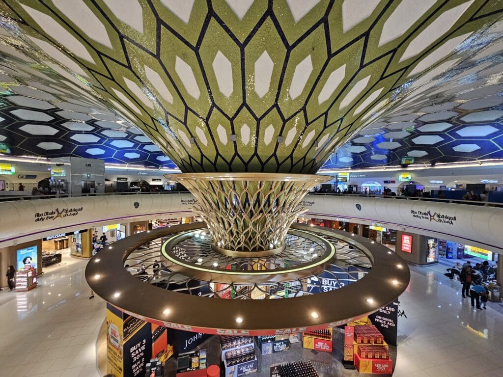 Once airside, I followed the crowds, and after stopping for a quick coffee, I arrived at Terminal 1’s central circular hub, in the centre of which is one of Abu Dhabi Airport’s most famous sights. This takes the form of a tiled funnel-like structure that rises from below, around which sits a good number of cafés, shops and restaurants, as well as plenty of seating. Five piers branch out from this central area, each with two jetbridges, whilst bus boarding gates can be found on the floor below. Whilst busy and slightly dated, appearing to be relatively clean, with ample seating, fast complimentary wifi and having enjoyed a quick journey from the landside to the airside areas that morning, Terminal 1 left me with little to complain about. However, it is worth noting that aviation enthusiasts may be disappointed to hear that airside views in this terminal are hard to come by, even at many of the terminal’s gates. However, these can be had away from the main circle, with the corridor from Terminal 1 to Terminal 3 providing a decent view of some of both terminal’s stands as well as the runway in the distance.