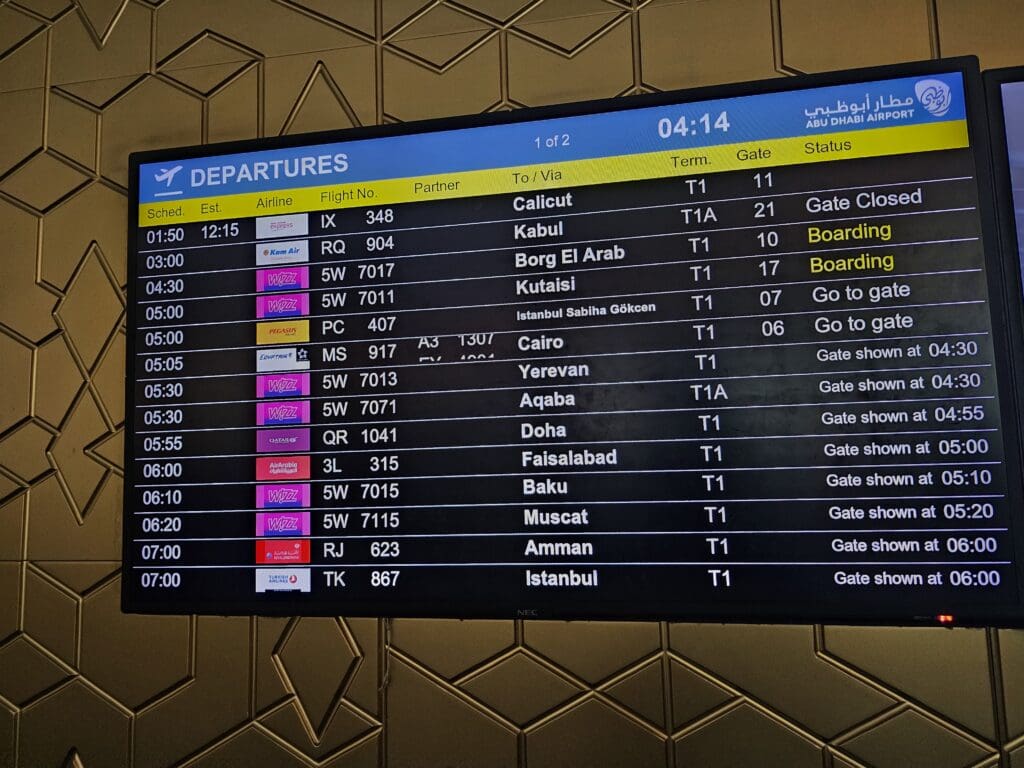 Looking at the departure boards, a total of thirteen flights could be seen on the departure boards up until 0710. Other than my flight to Qatar, I could have instead journeyed to Armenia, Azerbaijan, Egypt, Georgia, Jordan, Oman, Pakistan, Saudi Arabia or Turkey. Of these, a little over half were operated by Wizz Air’s local subsidiary, Wizz Air Abu Dhabi and as expected, a number of their pink, purple and white Airbus A321s could be seen waiting outside under the apron’s floodlights. As a UK-based enthusiast, the highlight movement seen during my stay in the terminal took the form of an Airbus A321 operated by Pakistani carrier Airblue – a carrier that once operated to Birmingham and Manchester. Unfortunately, I had arrived too late to see Kam Air’s Boeing 737 Classic departing off to the Afghan capital, Kabul, on its daily 0300 service.