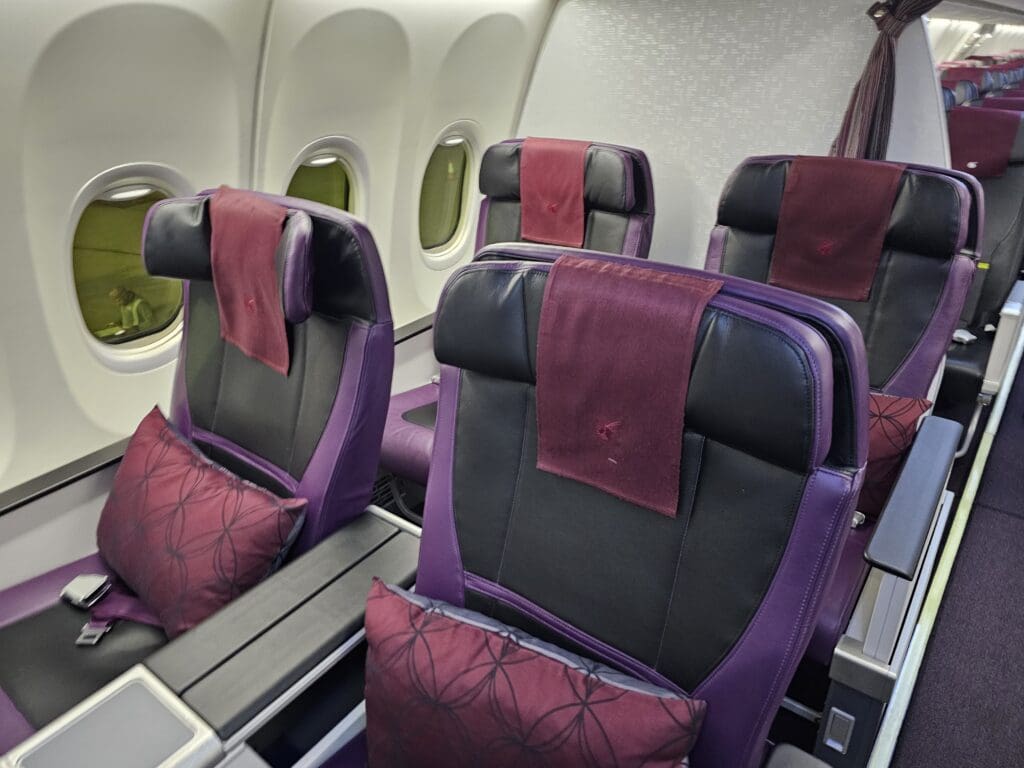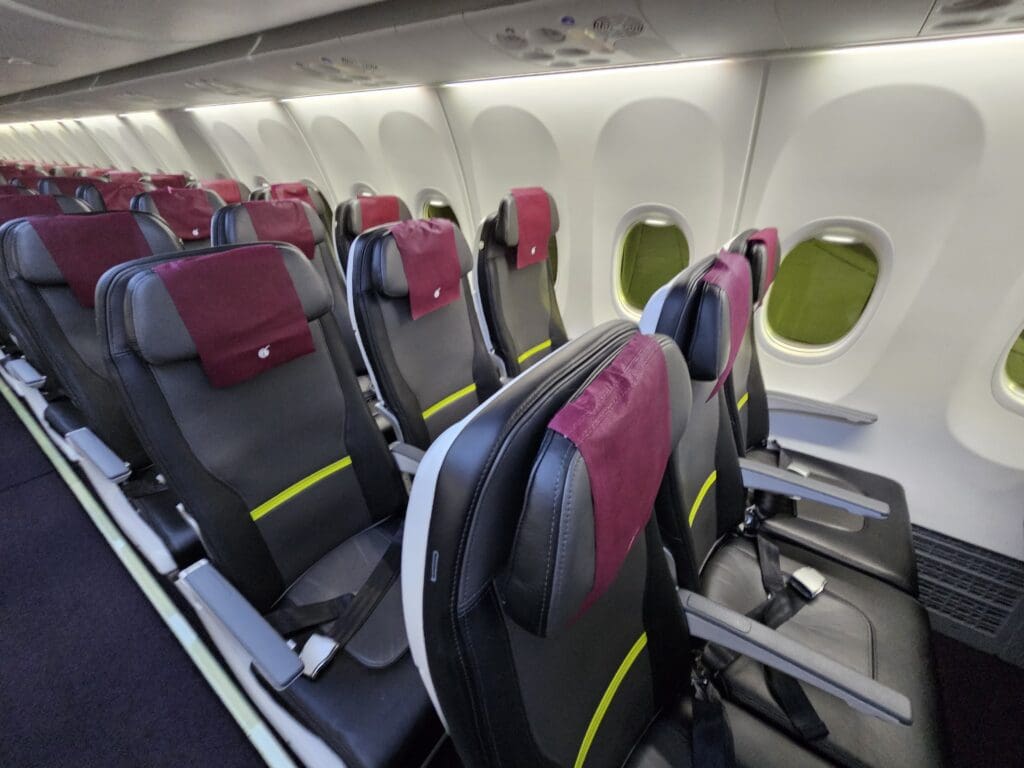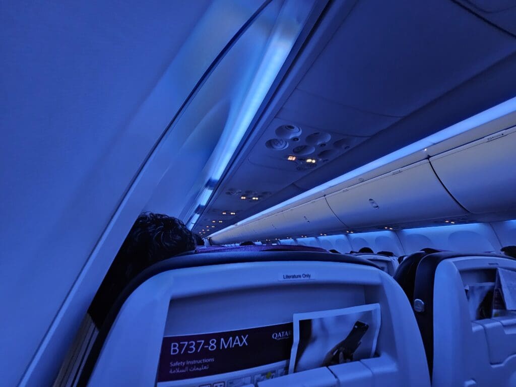 Turning right, I entered the Boeing 737 MAX’s bright and airy cabin where Qatar Airways’ boarding music – a fusion between Arab and Western classical music beamed through the cabin at a respectable volume for the early hour. Onboard, Qatar Airways’ Boeing 737 MAXs have a non-standard interior that does not bear a great resemblance to the cabins of any of their other aircraft, with very little burgundy. These aircraft instead feature the basic interiors of their original intended operator, S7 Airlines. Upon entering the cabin, I was greeted by the sight of the small Business Class cabin, which comprises of two rows of recliner seats in a typical 2-2 layout covered in a dark and purple pleather cover. Heading past these, I entered the Economy cabin, which is home to a total of 168 seats.