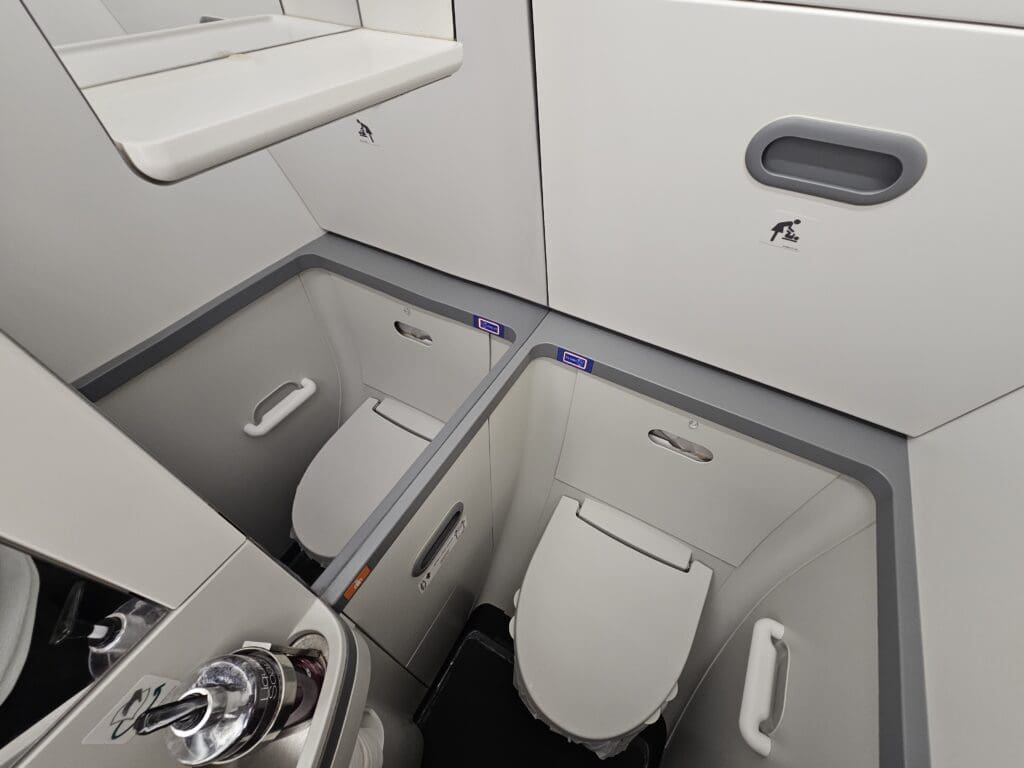 Appearing to be atypical of many seats on today’s narrowbody airliners, in Economy each seat was modern and slim. These were complete with an adjustable headrest, USB-A port, plug socket, fold-out device holder, seatback pocket and a literature compartment containing a sick bag, safety card and an information card detailing the onboard personal device streaming service named Oryx One Play. Focusing on their design, these are covered in a dark grey pleather cover with lime green stitching that reflects S7 Airlines’ branding. However, adding a Qatari touch, these also feature the airline’s burgundy disposable headrest covers. Whilst they are unlikely to be missed on the short flights that Qatar Airways’ Boeing 737 MAX 8s operate, unlike most of their other aircraft, these jets do not feature personal inflight entertainment screens. Once seated, I was pleased to find the seat to be comfortable and very spacious, with a fantastic amount of legroom. Unsurprisingly, this was in great condition, and I failed to spot any signs of wear and tear whilst the area around this appeared to be in a spotless condition. After stowing my bag, knowing that I would likely not get the opportunity to visit them later on during the flight, I decided to visit the lavatories at the rear of the Boeing. Unlike on my first and only Boeing 737 MAX ride that I had flown at this point, an Air Canada hop from Calgary to Vancouver, these were not squeezed into one corner of the galley and were instead located on either side of the aisle at the rear of the cabin, as they are on most Boeing 737NG aircraft. Upon entering one of these, I was pleased to find this to be clean, bright and relatively spacious and I was left with nothing to complain about.