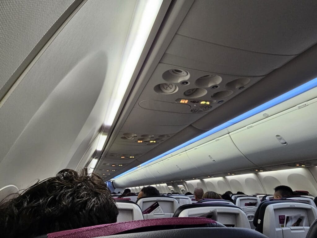 A short time after sitting down, a fellow passenger took the middle seat and slowly but surely, the cabin began to fill up. As passengers made their way onto the aircraft, one of the flight attendants made the occasional announcement regarding stowing luggage correctly and the prohibition of smoking and vaping onboard. Around thirty minutes after boarding had commenced, boarding was announced as complete and at a rough guess, I would say that around 85% of seats in Economy ended up being filled. That morning, passengers seemed to hail from all over the world, with no one single dominant nationality. Turning to the crew that morning, these hailed from Eastern Europe, the Philippines and South Asia.