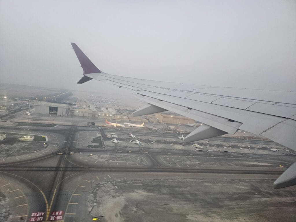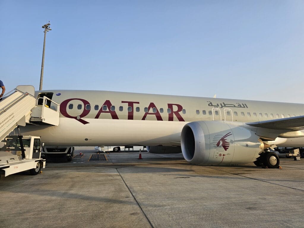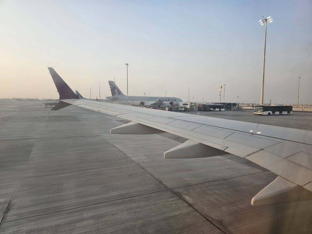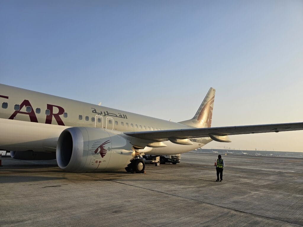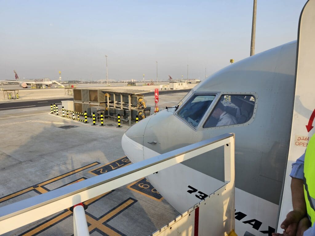 Indicating that we would be ending the journey at a remote stand, soon the aircraft vacated the runway to the left at which point the purser welcomed all to Doha and advised passengers to remain seated – an instruction which all thankfully obeyed. A few minutes later, the Boeing slowed as it neared a cluster of remote stands where plenty of Airbus A320s and Boeing 737 MAXs could be seen waiting for their next missions. Turning into the stand, once the aircraft came to a halt the cabin jumped up as if in a rush to exit the aircraft and there seemed to be some slight commotion at the very front of the aircraft as Economy passengers attempted to storm the Business cabin. As expected, ground operations in Doha seemed to be a well-oiled machine and almost as soon as the engines spooled down, a set of airstairs appeared, as did the luxury bus reserved for the exclusive use of those travelling in Business. This was soon replaced by two standard Cobuses for those in Economy, at which point we regular folks were allowed to disembark.