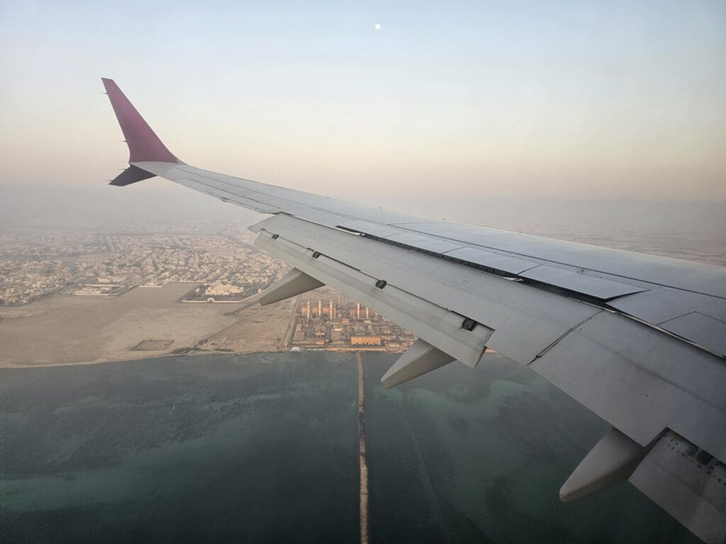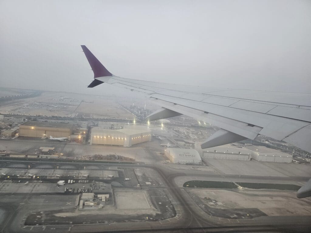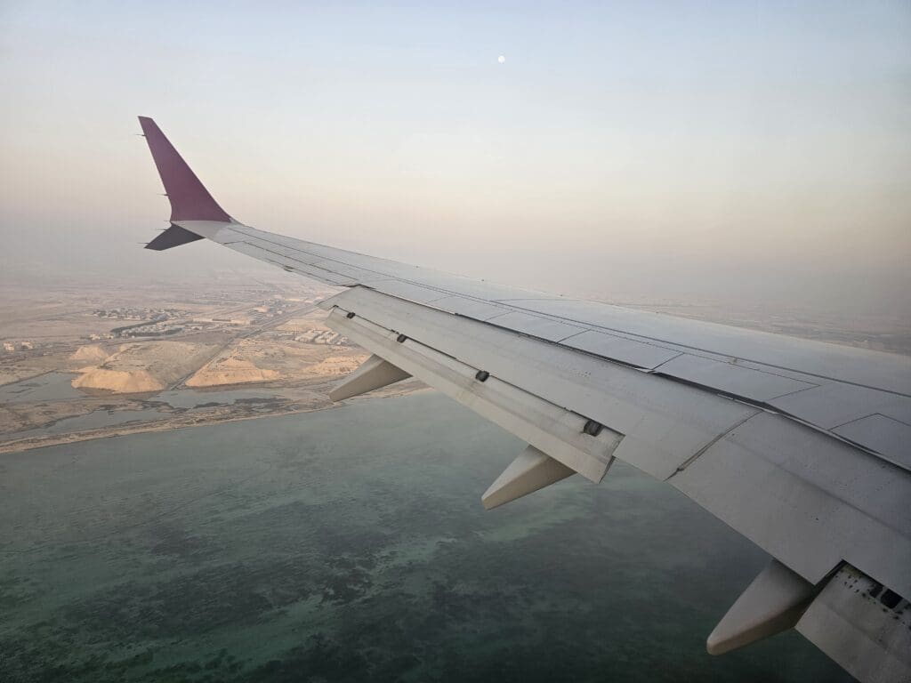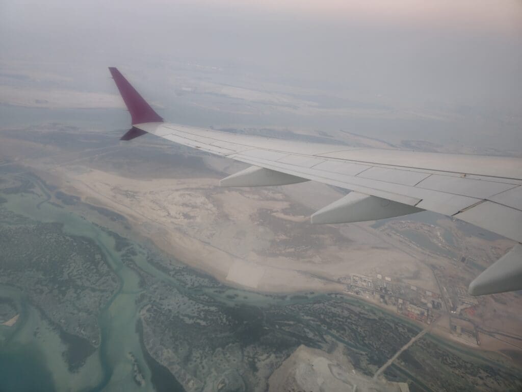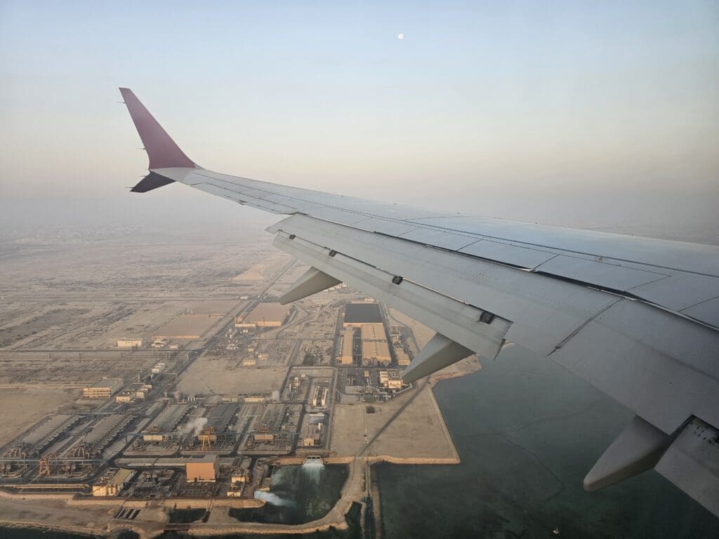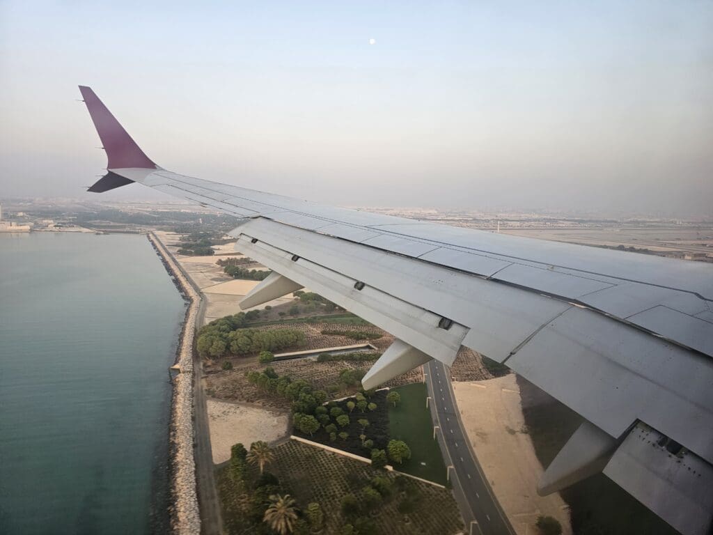 Upon reaching the island of Arzanah, which, like the others we had passed during the flight sits in the Emirate of Abu Dhabi, just seven minutes after levelling off the aircraft could be felt commencing its descent. At this point, the crew undertook one final pass through the cabin to ensure all was in place for our arrival. Outside, we soon crossed over the sandy shores of Qatar, making landfall near the city of Mesaieed. Heading northwards towards Doha, upon reaching the town of Birkat Al Awamer, which lies just beyond the capital’s southern fringes, the aircraft turned south away from the city and sped towards the massive but almost empty Hamad Container Port. From there, we turned north once again as the flaps dropped into position and we lined up for an approach to Doha Hamad’s Runway 34L.