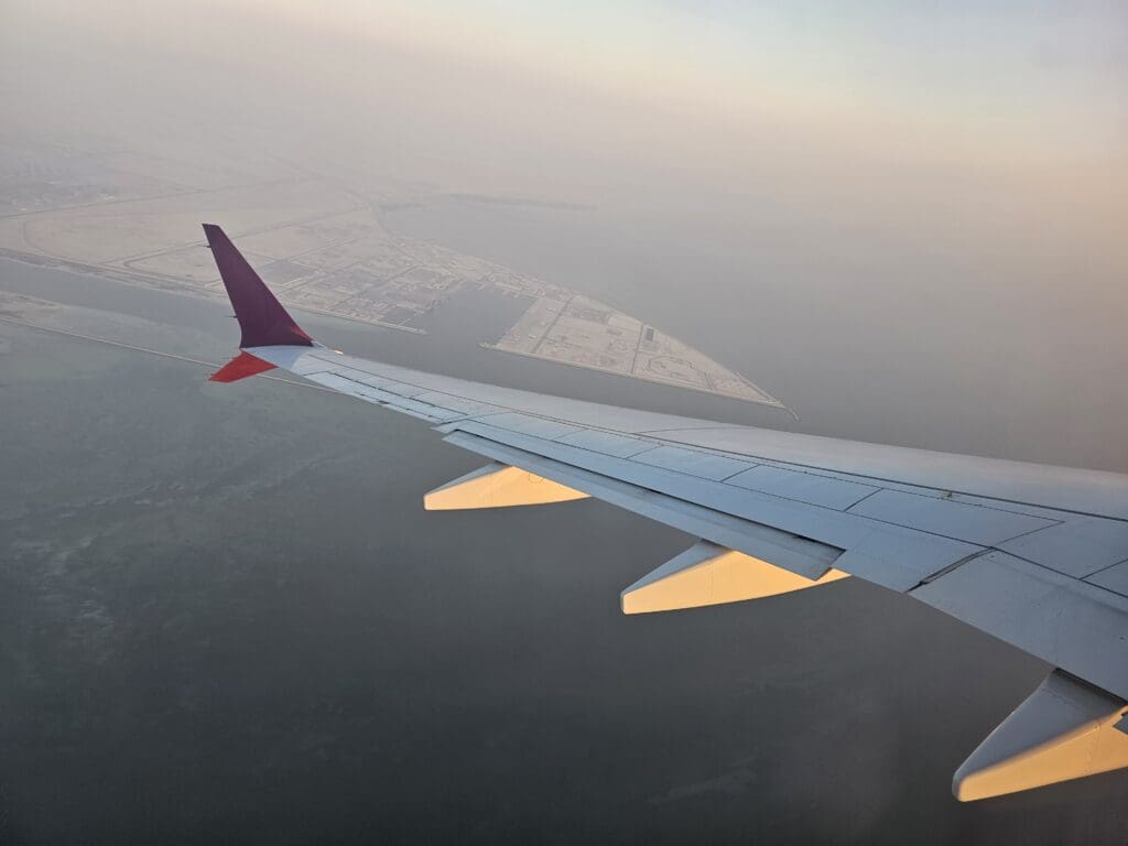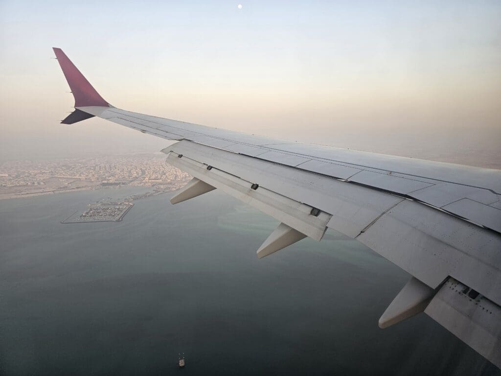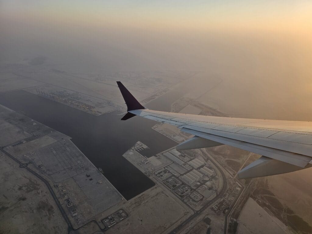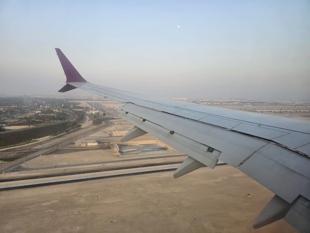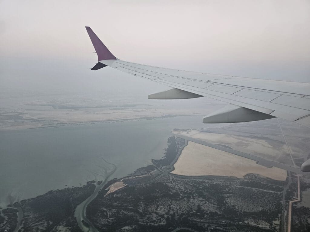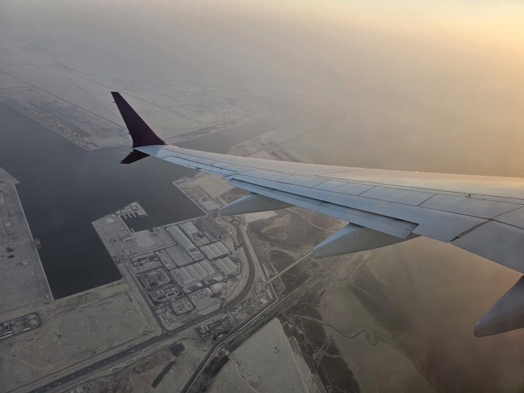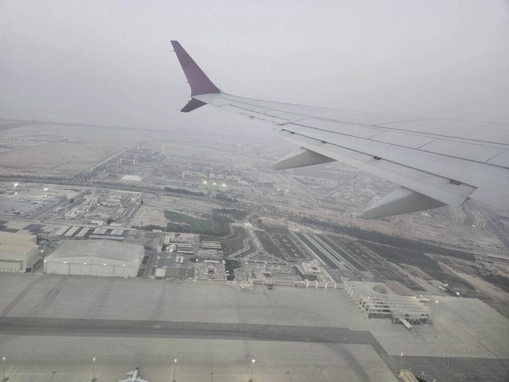 Upon reaching the island of Arzanah, which, like the others we had passed during the flight sits in the Emirate of Abu Dhabi, just seven minutes after levelling off the aircraft could be felt commencing its descent. At this point, the crew undertook one final pass through the cabin to ensure all was in place for our arrival. Outside, we soon crossed over the sandy shores of Qatar, making landfall near the city of Mesaieed. Heading northwards towards Doha, upon reaching the town of Birkat Al Awamer, which lies just beyond the capital’s southern fringes, the aircraft turned south away from the city and sped towards the massive but almost empty Hamad Container Port. From there, we turned north once again as the flaps dropped into position and we lined up for an approach to Doha Hamad’s Runway 34L.