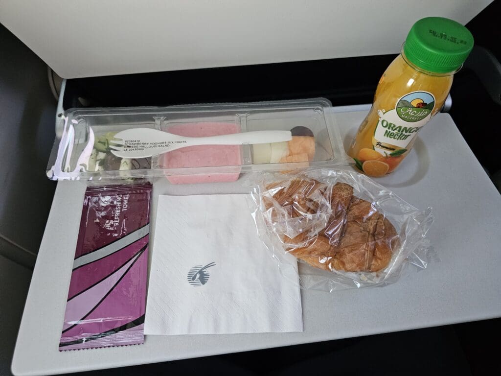 After leaving the Corniche behind, the crew took to the aisles at which point the onboard service commenced. Wasting no time nor resources, four crew members undertook this service in Economy with one trolley serving those in the front half of the cabin, whilst the other started at the exits in the middle and worked rearwards. Working diligently yet not sacrificing friendly or polite service, I was soon handed the offering onboard the flight. This came in the form of a warm packaged croissant, a plastic container with three small dishes – an olive and halloumi salad, a strawberry yoghurt and a small fruit salad, and a small bottle of orange juice. This was accompanied by a serviette adorned with Qatar Airways’ oryx logo and a packaged wet wipe. No other drinks were offered, although this was completely understandable given the short duration of the flight. Soon getting to work on the offerings, whilst someone hailing from France would have likely complained about the quality of the slightly soggy croissant, I was left with nothing to make a complaint about and soon polished this off.