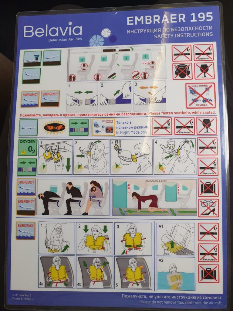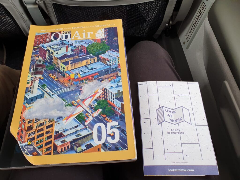 As we passed Row 10 and neared the centre of the aircraft, it became clear that we were to spend the flight in the spacious luxury of the emergency exit row. Upon sitting down, aside from the obvious superb legroom that these seats afforded, I found the seats themselves to be well padded and comfortable. However, I also ought to note that I sampled a ‘regular’ Economy seat later on whilst waiting for the bathroom and found these to be a little cramped. Having spent three hours on the ground after arriving from Georgia early that morning, the aircraft appeared to be spotlessly clean whilst unsurprisingly I failed to spot any signs of wear and tear. Turning to the seatback pocket, these contained a copy of Belavia’s OnAir magazine, a sickbag and a map of Minsk highlighting the city’s tourist attractions and sights. The latter being a rather nice and welcoming touch for those Minsk bound passengers from abroad visiting Belarus’ capital.