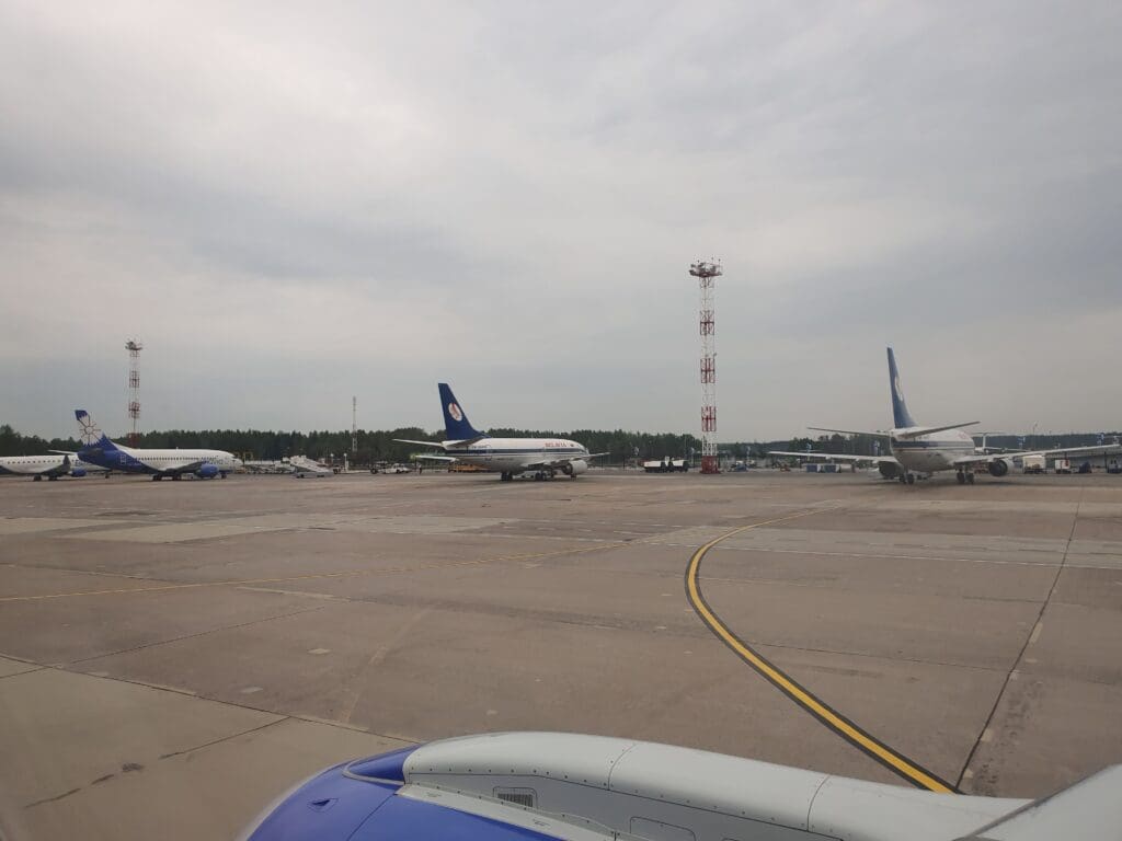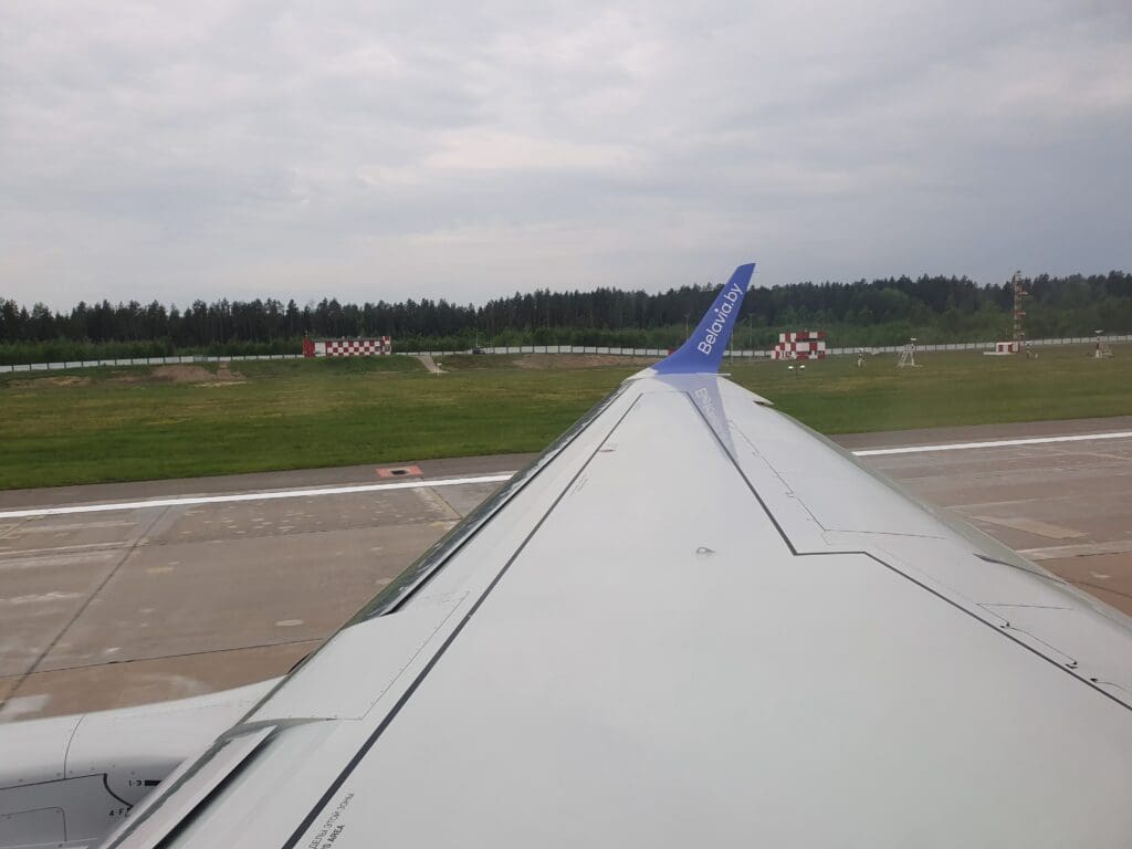 After the Captain had concluded their welcome announcement, the Purser welcomed all passengers onboard, with this announcement transitioning to the safety instructions during which two crew members took to the aisle to perform a demonstration. I ought to mention that despite sitting in the exit row, no additional briefing was provided with us, nor did the flight attendants visit us to confirm that we were happy to operate the exit in the event of an emergency. Despite the Captain’s mention of a thirty minute delay, in the end the aircraft jolted back at 0940, just ten minutes behind schedule. Upon coming to a halt, the Embraer’s two General Electric CF32 engines quietly spooled up into life and a few minutes later, we commenced our taxi to the end of Runway 13R. As we made our way to the runway, the aircraft passed a total of four Belavia aircraft – three Boeing 737 Classics and a single Embraer 175. Having perhaps overestimated the severity of the delay, sixteen minutes after our departure time, without any holding the aircraft taxied onto the runway at which point the Purser conducted an announcement regarding our imminent departure.