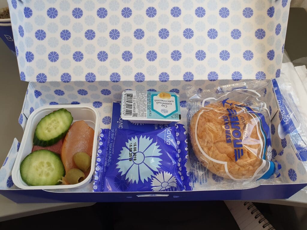 Moments after I returned, the Embraer levelled off at 36,000 feet as we neared Belarus’ western border with Poland. Much to my surprise, at this point, the Captain gave another welcome announcement during which they provided an even more in-depth summary of our route to Amsterdam and thanked us for flying with Belavia. As we crossed into Polish airspace near the city of Bialystok, two crew members rolled a trolley from the rear galley all the way through the cabin to the Business cabin indicating the commencement of the breakfast service. Approximately ten minutes later, the two cabin crew members approached my row and I was handed a Belavia branded box before being asked whether I would like coffee, tea or water in a cold and emotionless manner. Having received a warm main dish on my previous flights with Belavia, I was hoping for a similar meal on this flight. However, instead this box contained a small cold salad featuring several cuts of meat, olives, cheese and cucumbers, a bread roll, a container of cheese spread and a chocolate glazed zephyr for dessert. Whilst this was slightly lacking compared to the previous meals I received on Belavia flights, all in all, I could hardly complain. Indeed, this light breakfast proved to be far more substantial than the complimentary offerings on most intra-European flights.