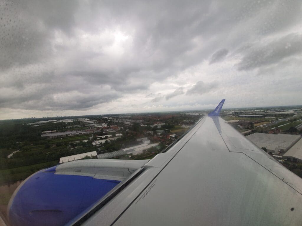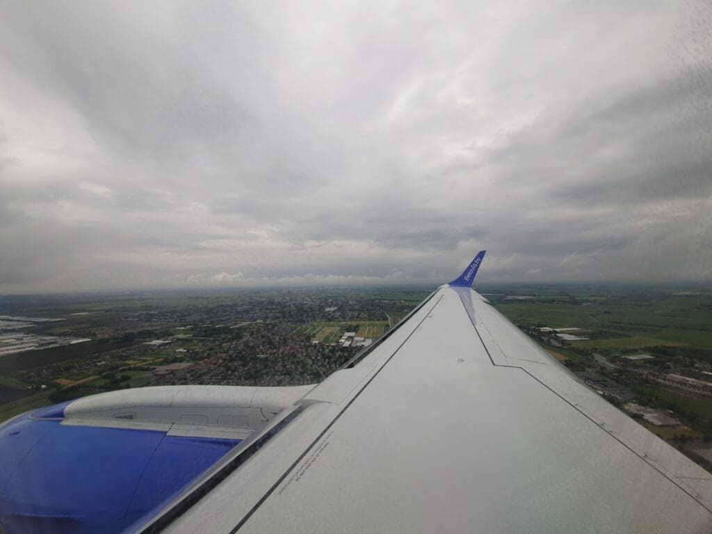 As the aircraft flew over the German state of Lower Saxony and towards the Netherlands, at around 1045 local time the relatively quiet engines got even quieter and the aircraft could be felt sinking downwards. No more than five minutes later, the Purser performed their pre-arrival announcement with the usual instructions regarding tray tables, seatbacks, seatbelts and window shades. This was ended with a claim that the aircraft would land in ten minutes which seemed to be rather optimistic. This was soon counteracted by the Captain who informed us that we would land in fifteen minutes and the weather in Amsterdam was cloudy with a chilly temperature of 11 degrees. After entering Dutch airspace, the Embraer passed over the northeastern province of Overijssel and towards the small city of Zwolle before turning west over Flevoland. At this time one of the crew members passed through the cabin ensuring all was secure for our arrival and opening the curtain between Business and Economy allowing for glimpses of those lucky enough to be flying in the former cabin.