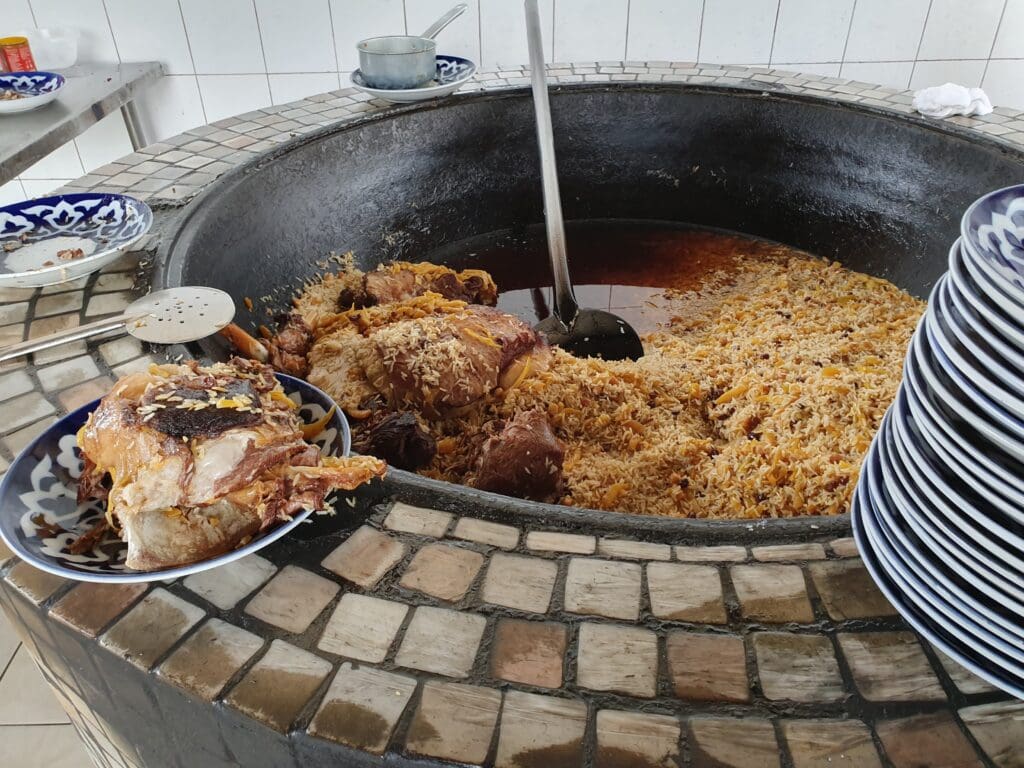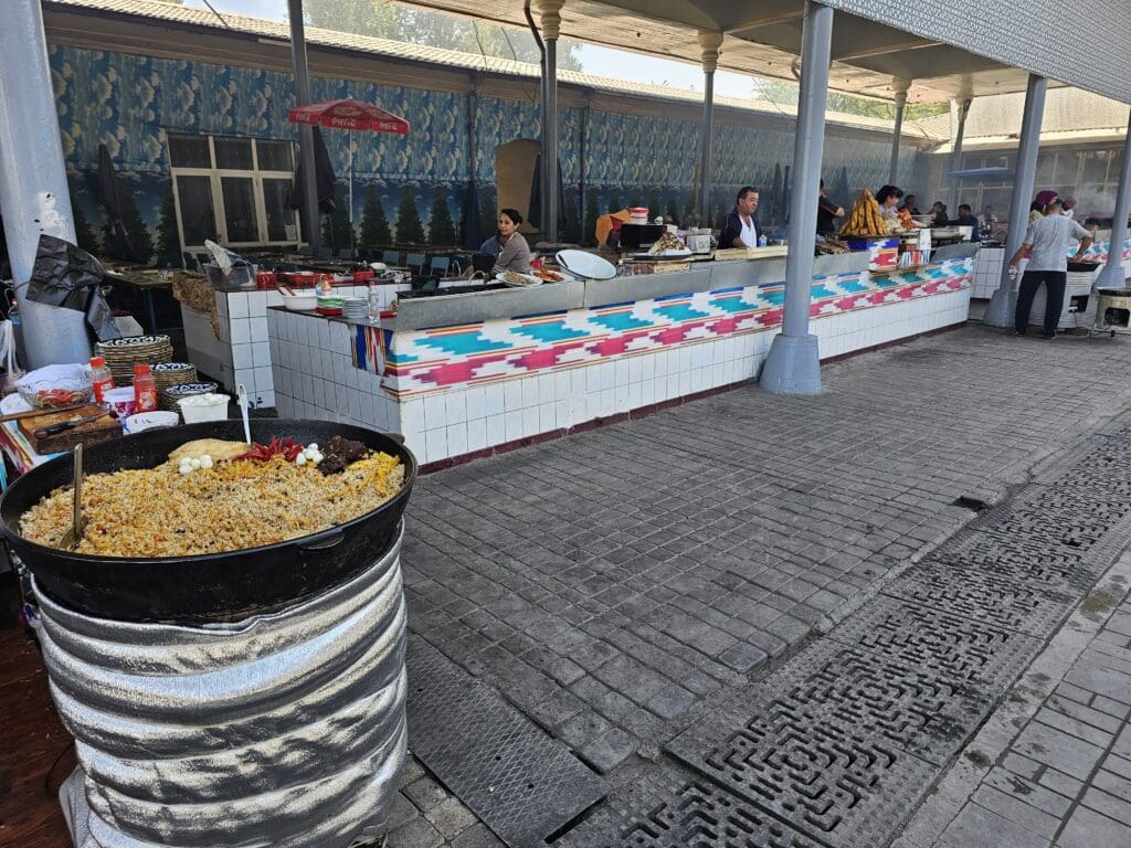 If you’re expecting the typical capital city chaos, such as blaring horns, endless traffic, and rows of grey concrete high-rises, Tashkent may well surprise you. Wide, tree-lined avenues and leafy parks break up the urban sprawl, and its skyline is a quirky mix of stern Soviet-era blocks, tall glass towers, and colourful local flair. Furthermore, the city hosts a cornucopia of galleries and museums offering insights into Uzbek history and culture. Meanwhile, independent coffee shops have carved out their space on many corners, offering a break from sightseeing. Although, for those wanting to keep local, you’ll also find street vendors selling hot non and flaky samsas and stalls selling fresh plov – Uzbekistan’s beloved rice dish cooked with meat, vegetables, and fragrant spices.