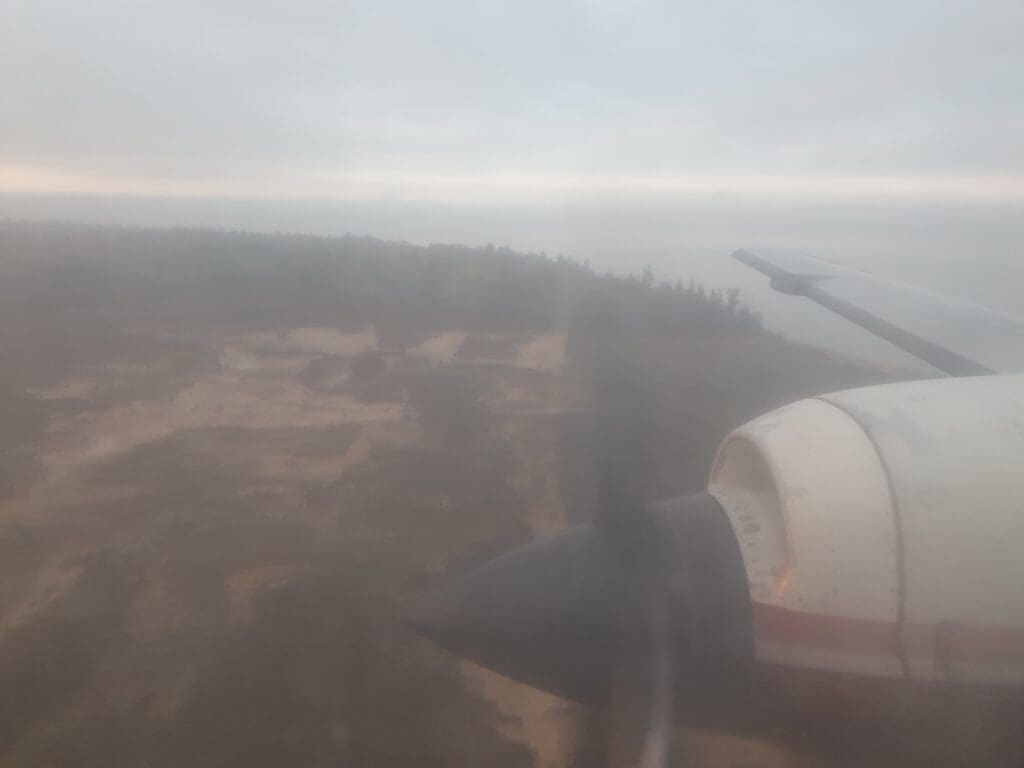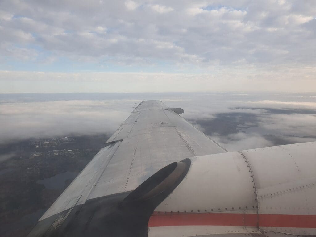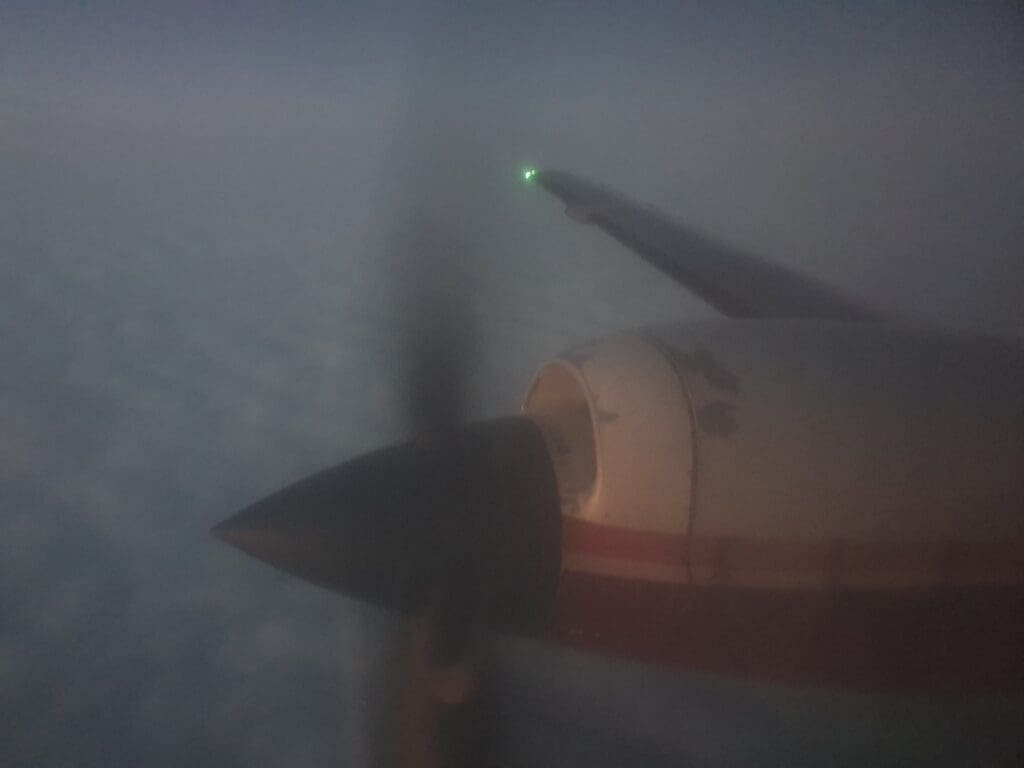 At 0905, the noise produced by the aircraft’s two engines decreased slightly as these were powered back in preparation for the aircraft’s descent. Unlike on the first flight, an announcement from the cockpit was made, however, this was entirely inaudible – although I assume it had something to do with our descent and arrival. A couple of minutes after leaving our cruising altitude, the aircraft descended downwards into the clouds and was thrown about slightly as the Metroliner ploughed through these.