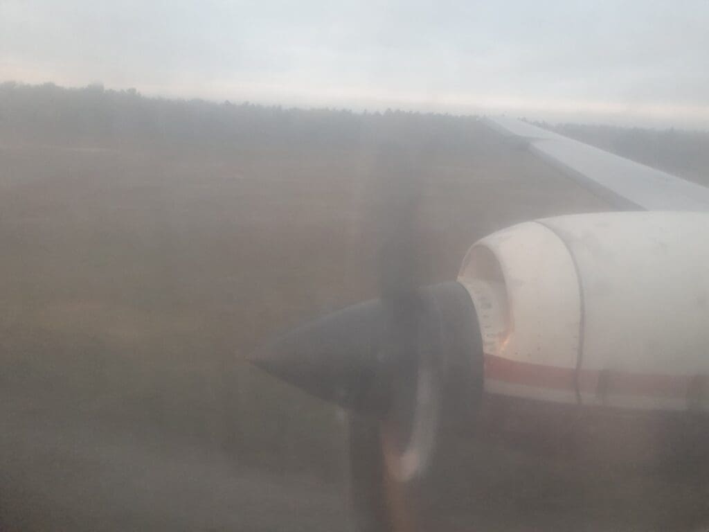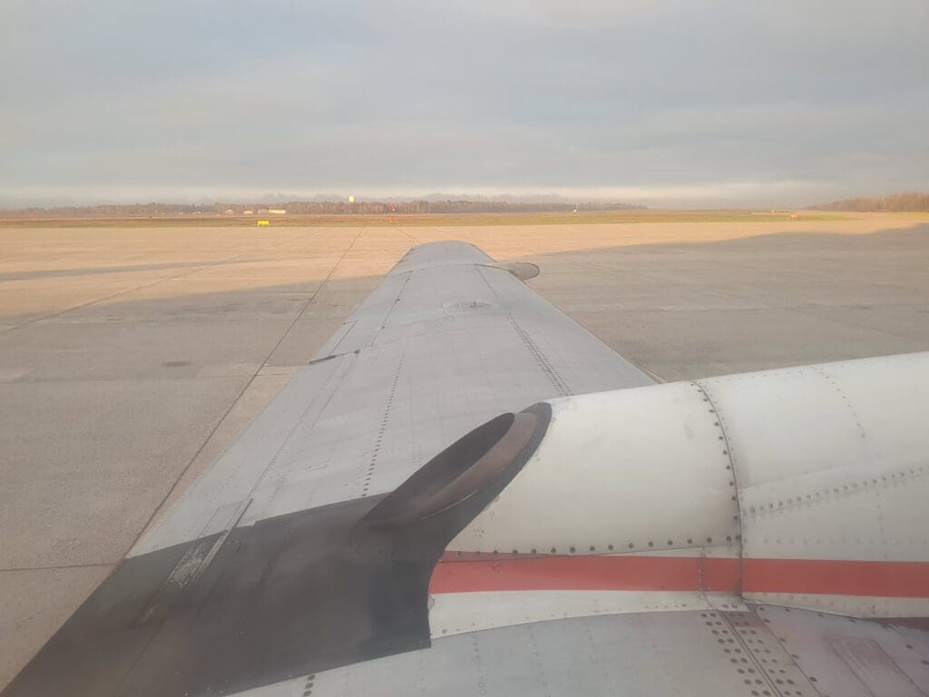 Being the final passenger to board the aircraft, and seeing as the flight across to Sault Ste. Marie was full that morning, so I ended up taking the only remaining vacant seat – 1B positioned right behind the cockpit. Whilst this meant that I would not have the hassle of squeezing down the 142-centimetre high cabin, or, more appropriately, pipe, I would have to put up with a rather poor amount of legroom, with my legs squished right up to the bulkhead that separates the cabin from the cockpit. Furthermore, I would also enjoy a good view of the action up ahead and the engine, albeit through a rather scratched and blurry window.