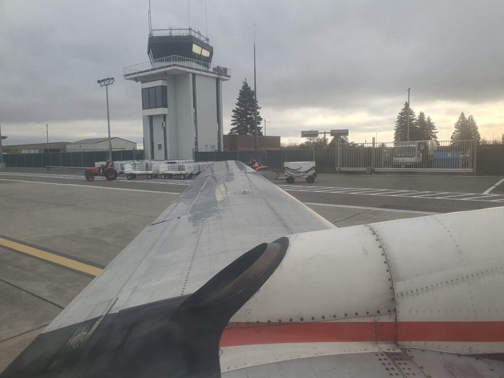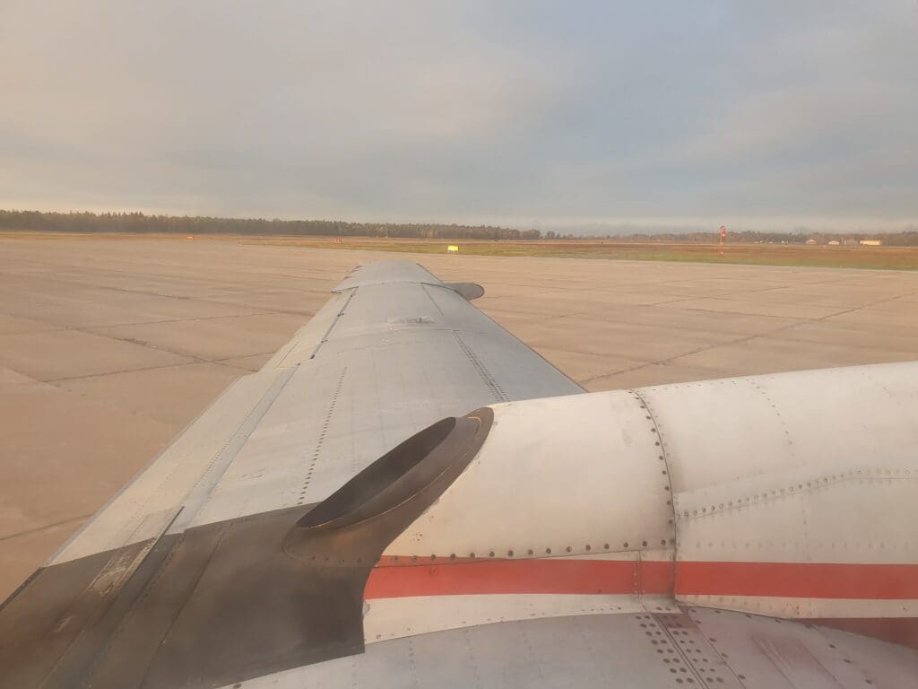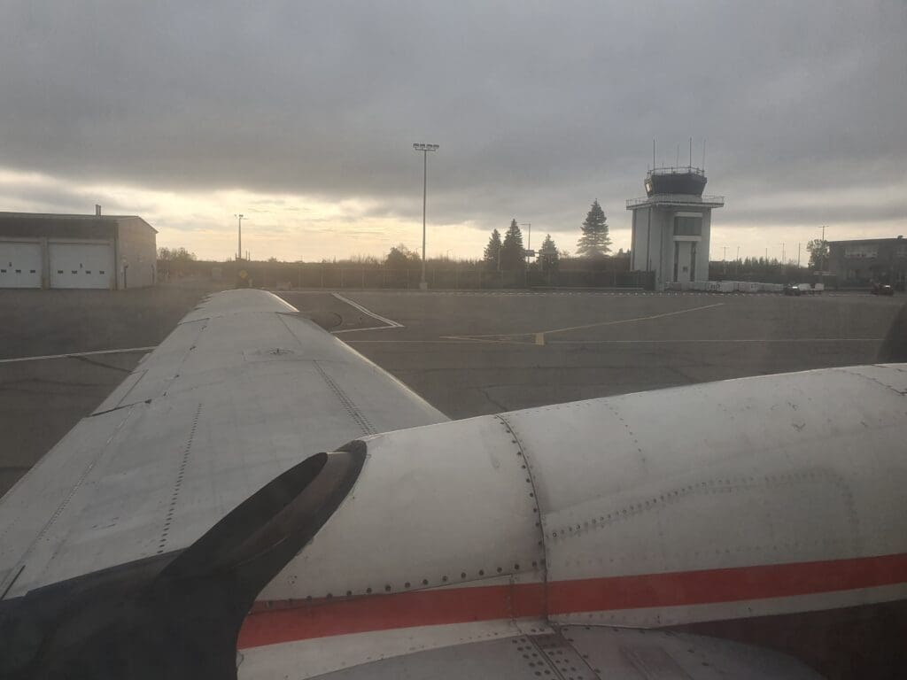 Temporarily settling at an altitude of 3,900 feet, the flaps were soon deployed and the aircraft sank downwards into the clouds. Within a couple of minutes, Lake Superior appeared beneath the aircraft once again and the tree-lined shores near Pointe Des Chenes soon popped into view through the mist. Seconds after crossing the shoreline, the Metroliner made a firm touchdown on runway 12 at 0822, ending the first 55 minute leg of the aircraft’s trek over to North Bay that morning. Once back on the ground, the cabin filled with noise as the Metroliner rapidly decelerated before turning left and vacating the runway. Far from Ontario’s largest airport, from the runway, the Metroliner’s journey over to Sault Ste. Marie Airport’s terminal was quick and the aircraft soon parked up on the empty apron right outside the terminal.