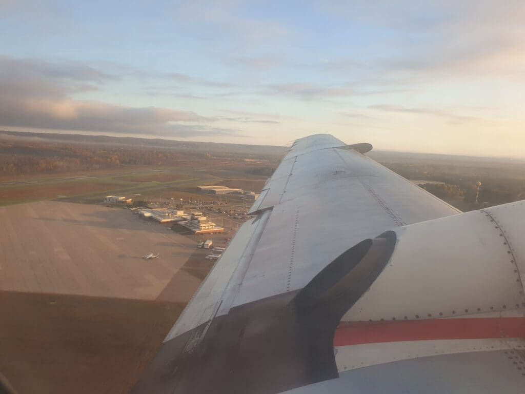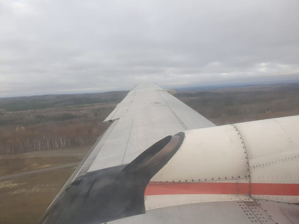 Ten minutes after commencing the descent, the forests and lakes surrounding Sudbury came into view through gaps in the low-lying cloud that lingered around the city that morning. A short time later, glancing through the window on the opposite side of the cabin, I spotted Sudbury appear before passing below the starboard wing of the aircraft. As the Metroliner made its way towards the airport, the aircraft was once again through about a little, shaking and swaying from side to side before the ride smoothed out a little as we neared the airport.