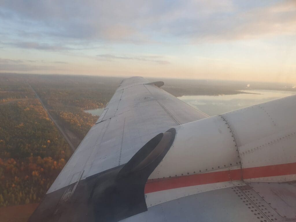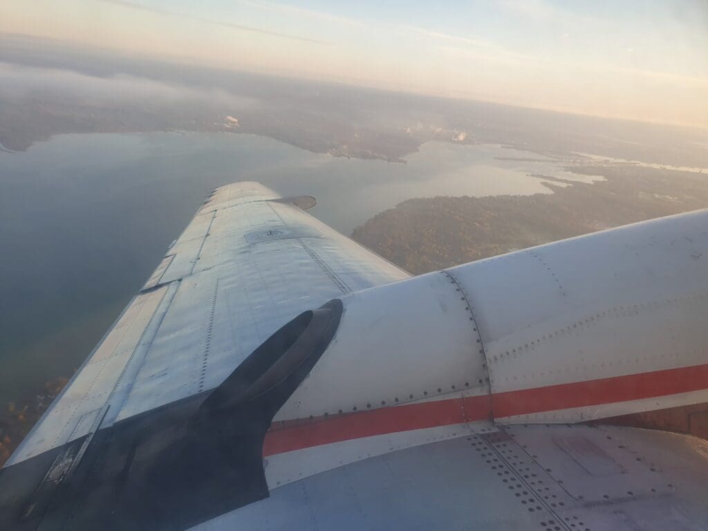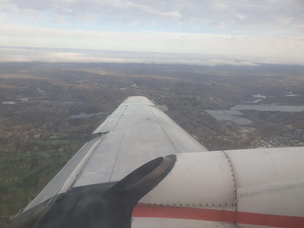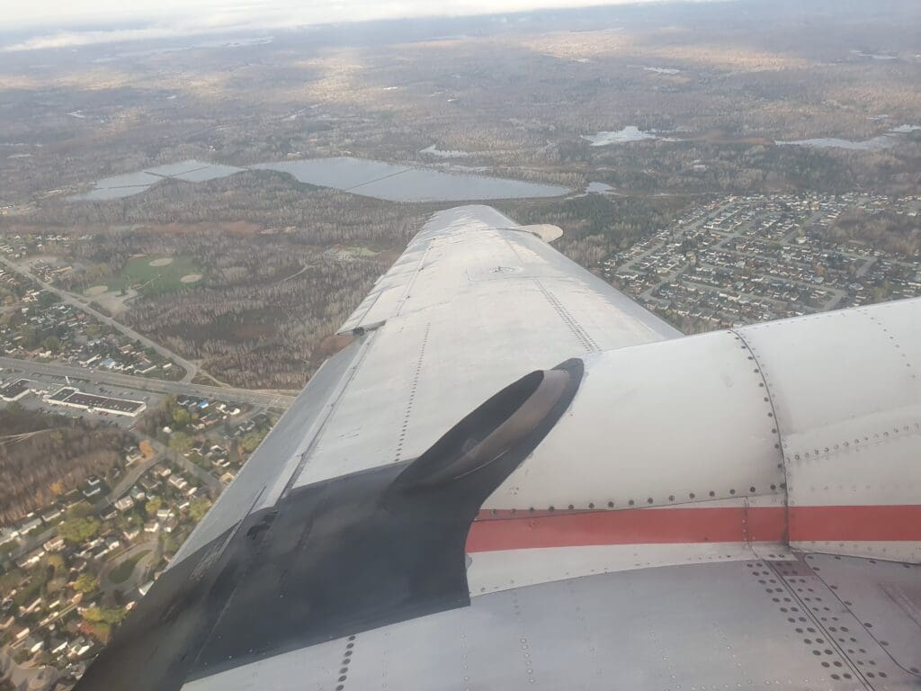 Having been on the ground for just under twenty minutes, at 0841, the Metroliner’s cabin filled with noise and vibration once again as the turboprop performed a powerful rolling takeoff before heading upwards into the Ontarian skies. Once away from the airport, the Metroliner passed over Pointe Aux Pins before heading out over the St Marys River at which point the aircraft rose into the clouds before reaching the centre of Sault Ste. Marie. Thanks to the clouds, very little could be seen of the Ontario wilderness as the aircraft crossed over the various provincial parks that separate Sault Ste. Marie and Sudbury, flying roughly parallel to the famous Trans-Canada Highway.